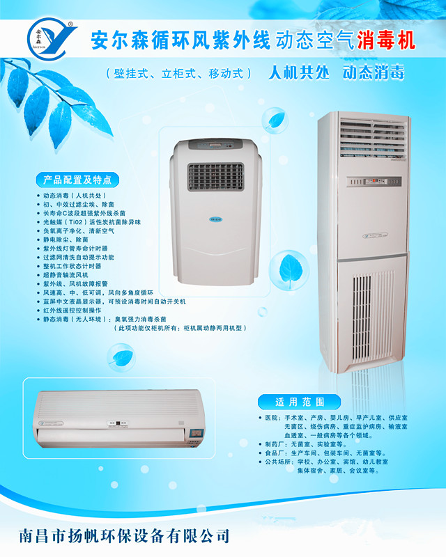 南昌市揚(yáng)帆環(huán)保設(shè)備有限公司于2001年成立,研發(fā)、、供應(yīng)銷售醫(yī)用空氣消毒機(jī),醫(yī)用空氣消毒機(jī),醫(yī)用空氣消毒機(jī)分四大類產(chǎn)品:1,移動(dòng)式醫(yī)用空氣消毒機(jī):醫(yī)用移動(dòng)空氣消毒機(jī),有動(dòng)態(tài)空氣消毒機(jī)和動(dòng)靜兩用型空氣消毒機(jī)。2,壁掛式醫(yī)用空氣消毒機(jī):此款屬于動(dòng)態(tài)空氣消毒機(jī),人機(jī)共處消毒機(jī)。3,醫(yī)用柜式空氣消毒機(jī):此款是動(dòng)靜兩用醫(yī)用空氣消毒機(jī),動(dòng)態(tài)消毒采用紫外線消毒、負(fù)離子發(fā)生器、光觸媒過濾網(wǎng)、活性炭過濾網(wǎng),主要適用icu重癥病房、手術(shù)室等40-50㎡的消毒空間。4,靜態(tài)醫(yī)用空氣消毒機(jī):移動(dòng)式醫(yī)用臭氧消毒機(jī)和壁掛式醫(yī)用臭氧消毒機(jī)兩種。產(chǎn)品具有四川華西醫(yī)科大學(xué)(***指定檢測中心)出具的消毒效果檢測報(bào)告,且產(chǎn)品獲得了中華人民共和國消毒器械衛(wèi)生許可批件及 9001 ,讓您買的放心,用的安心。